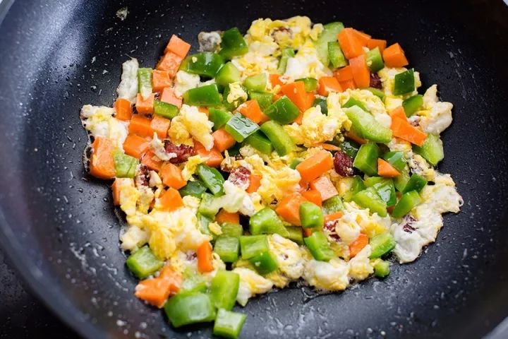 ▼ 6. 加入辅料:加入切好的胡萝卜、青椒,筷子换成锅铲,继续翻炒。