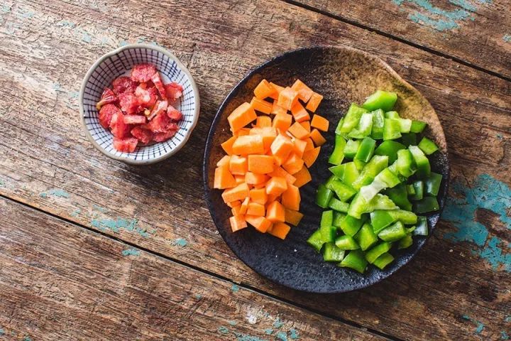 ▼ 1. 处理辅料:腊肠切小片,胡萝卜和青椒分别切丁,放在盘子里待用。
