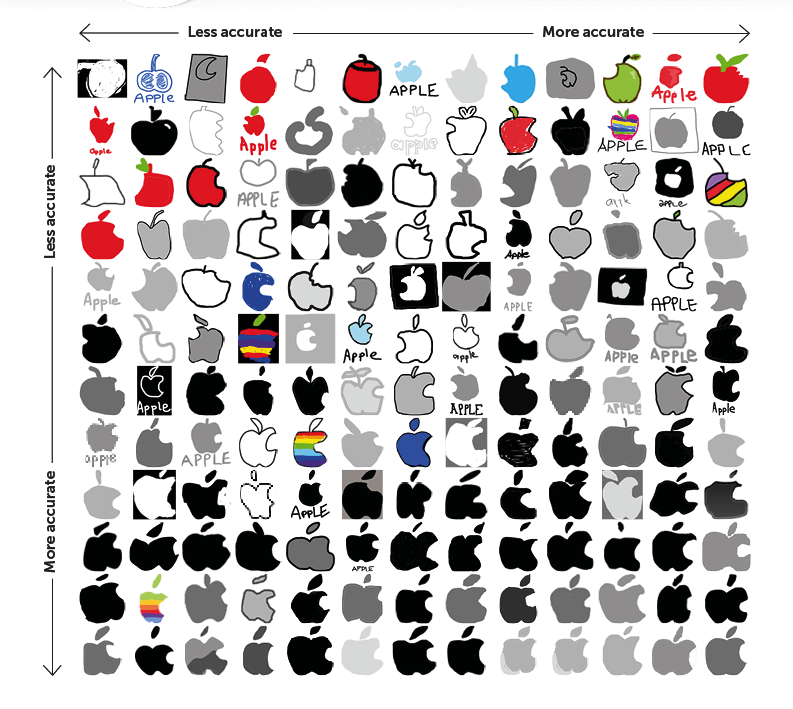 在参与调查的一百多号人的笔下,苹果被画成下面这样。在这张图中,横向坐标越往右边越和正确的相似,纵向坐标越往下则与越和正确的相似。
