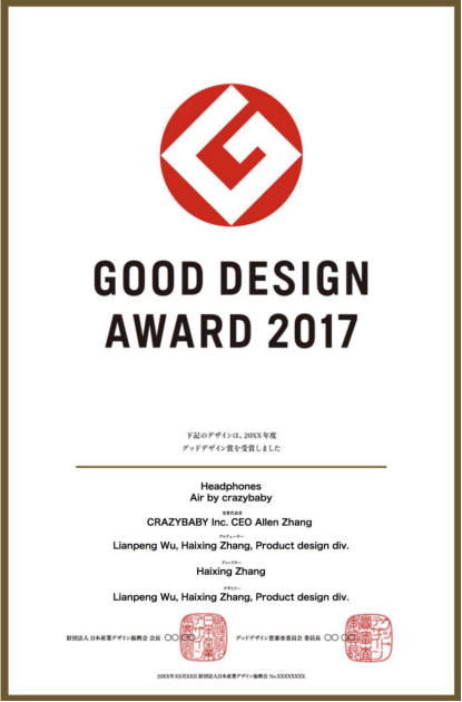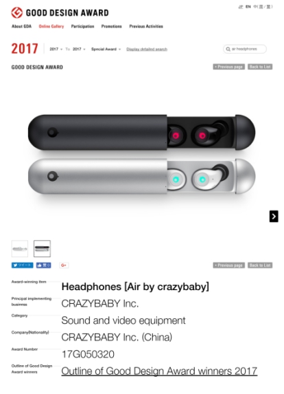 本月初,Good Design Award 优良设计大奖(也称G-mark)陆续公布2017年度获奖名单。中国智能硬件新锐品牌crazybaby旗下真无线耳机Air by crazybaby顺利摘取2017年Good Design Award,这也是该品牌继斩获2016、2017德国红点奖,2017美国CES最佳创新奖、CES耳机类目创新奖之后,再次获得国际重磅设计奖项的认可。