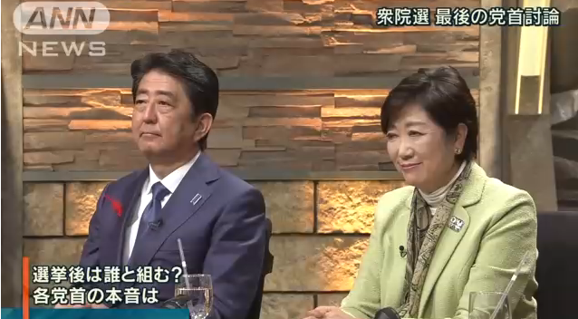 据日本朝日电视台报道,10月10日,日本发布了第48届众院选举公告。11日晚,野8党党首在日本朝日电视台举行了选举战最后的党首辩论会,他们分别是日本自民党安倍晋三、希望之党小池百合子、公明党山口那津男、共产党志位和夫、立宪民主党枝野幸男、日本维新党松井一郎、社民党吉田忠智、日本之心党中野正志。