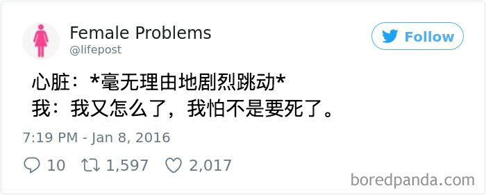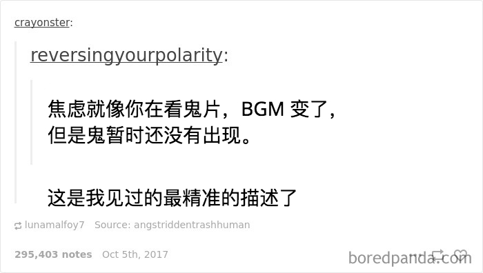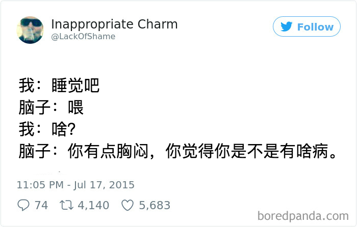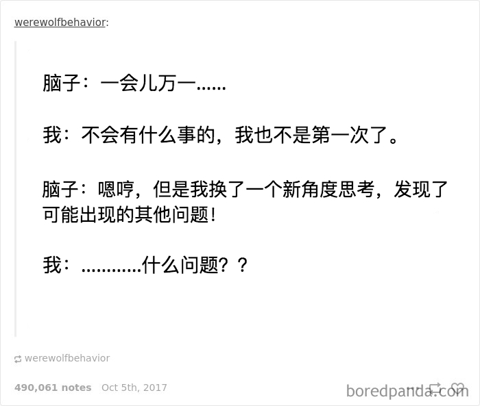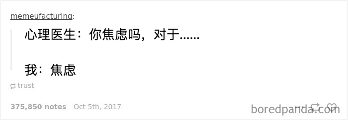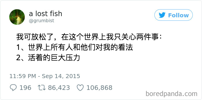 原标题:15 个对焦虑的描述,中10 条以上建议你找人聊聊了1. 关爱焦虑症患者,不要迟到2. 学会抢答3. 是本社恐4. 希望自己的脑子闭嘴5. 莫名心跳加速6. 四舍五入就是无忧无虑了7. 不知所