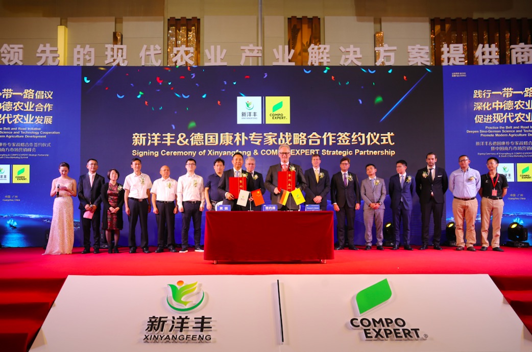 2017年10月11日,湖北新洋丰肥业股份有限公司(以下称“新洋丰”)与德国康朴专家公司(COMPO EXPERT Gmbh)(以下简称“康朴专家”,目前被全球领先的私募股权投资基金XIO Group拥有)在农业部农技推广中心高祥照首席专家、德国大使馆广州总领事Martin Fleischer先生、中国磷复肥工业协会修学峰副会长等嘉宾的见证下,正式签署合作协议:即日起双方就稳定性肥料业务展开战略合作。新洋丰与康朴专家发挥彼此优势,立足中国市场,聚焦经济作物和高附加值作物营养系列产品,双方通过技术合作、本地化生产和品牌渠道叠加,实现深度融合,互利共赢,获取增量,为促进化肥零增长行动、农业提质增效和农民增收贡献力量。这预示着新洋丰进一步升级产品结构,深化新型肥料市场布局,朝着中国肥料“做强做大做优”的目标又迈进了一大步。