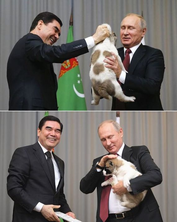 当天,普京在黑海海滨城市索契会见到访的土库曼斯坦总统库尔班古力·别尔德穆哈梅多夫。美联社报道,正式会谈开始前,别尔德穆哈梅多夫把这只可爱的幼犬从笼子里拿出。他说:“我们有着共同的朋友,这是世界上独一无二的(顶级品种)中亚牧羊犬。今天,我将它带来(送给你)。”