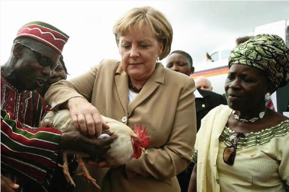 2007年,德国总理默克尔访问利比里亚时获赠一只象征吉祥的鸡。(图片来源:德国《每日镜报》网站)
