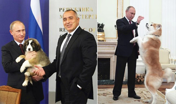左,2010年11月13日,索菲亚,保加利亚总理博伊科·鲍里索夫送给俄罗斯总理普京一只牧羊犬;右,2016年12月7日,克里姆林宫,俄罗斯总统普京与秋田犬戏耍。(新华/美联)