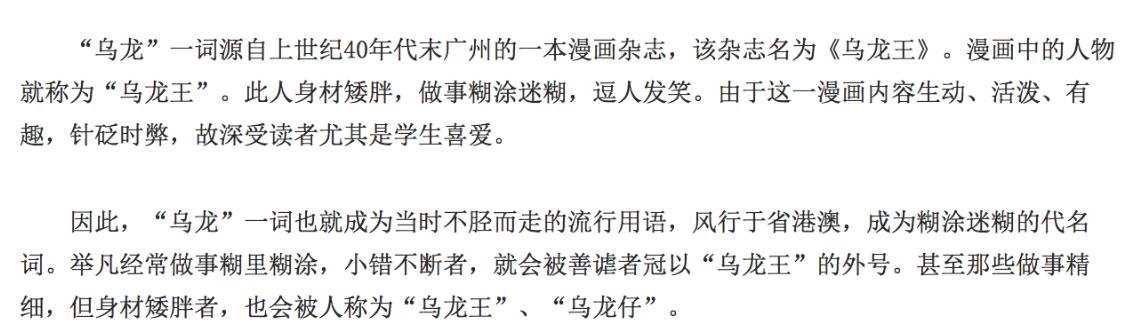 不过,无论如何这也无法和「阴差阳错」的意思结合在一起。于是又有人提出「乌龙」一词,根本就是出自香港漫画《乌龙王》。不过这一文章刊登不到一周,就有年老的读者提出质疑,提出在该漫画流行之前就已经有「乌龙」的说法。