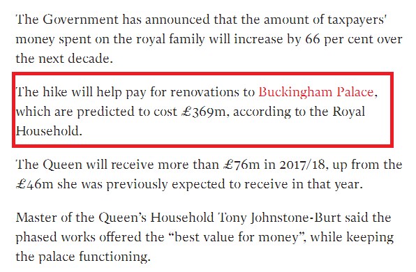 英国政府宣布,将拨款约3.7亿英镑(1英镑兑换8.7061人民币),为女王伊丽莎白二世在伦敦的官邸白金汉宫,进行为期十年的装修计划。