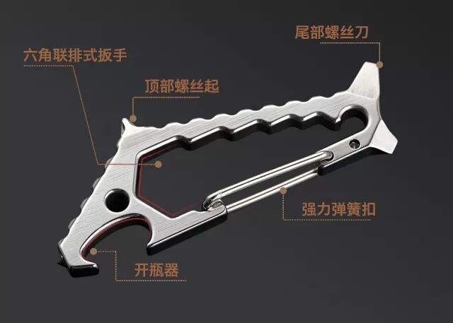 功能:挂扣、开瓶、扳手、螺丝刀、螺丝起、破窗防身