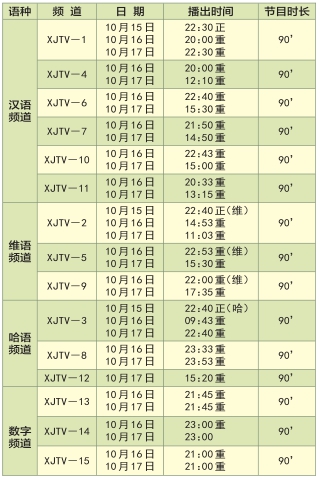 本台晚会将于10月15日22时30分在新疆卫视汉语频道播出,维吾尔语新闻综合频道和哈萨克语新闻综合频道均在22时40分播出。具体播出时间表如下: