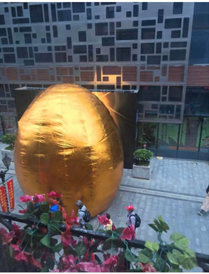 据了解,这个金色巨蛋是一个高8米、直径3米的巨型气模蛋,在楚河汉街儿童乐园前广场一经展出,就吸引了众多行人目光,蛋在倒数计时牌归零后准时破壳,露出巨蛋之后的“转换鸡”。这个“转换鸡”也不简单,它是一个神奇的机关,路人可以在特制的机关入口,塞入随身物品进行神奇的转化,比如塞进去5块钱吐出来10块钱,正如它标语所说的那样——“孵化能力非同一般”。