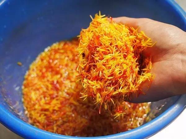 从这些记载中我们可以看到,中日古人加工红花的方法大同小异,这是因为红花的花瓣中含有红花红色素和红花黄色素,顾名思义,颜色一红一黄,加工的第一步就是要把这两种色素分离开。红花黄色素易溶于水,红色素难溶于中性的水,在碱性环境下溶解度才能升高,所以在加工时都需要先用水溶解掉黄色素,利用微生物发酵释放出的有机酸令红色素沉淀,再用含有碳酸钙成分的碱性河水和苎麻纤维将红色素提纯出来。