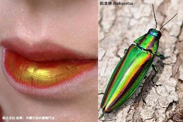 红花色素中红色素只占1%,一千克鲜红花只能提取出3克红色素,价格高昂,江户时代有“金一钱、红一钱”的说法,涂玉虫色的消耗量太大,普通人家用不起,只好用墨先涂在嘴唇上,再覆盖上红色,也能呈现出一点金属光泽。