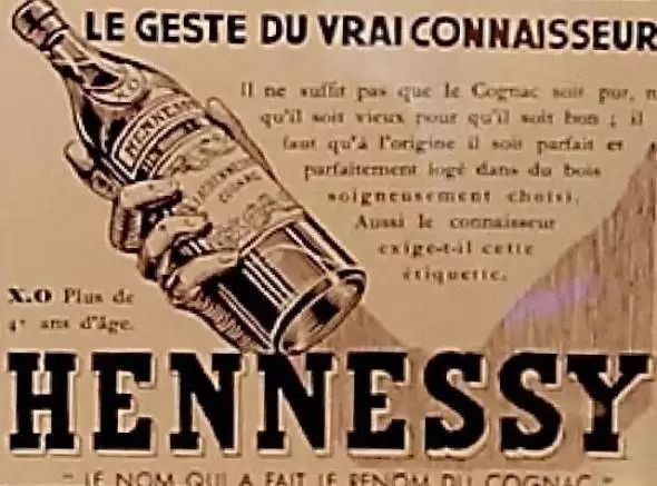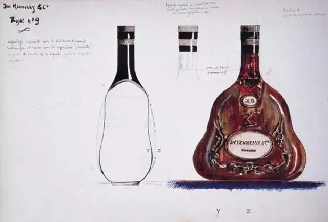 1947 年,轩尼诗家族的后裔 Gérald de Geoffre 设计新款轩尼诗 X.O 酒瓶时,受上下颠倒的葡萄串形状启发,摒弃了常见的竖直形状,采用了曲线设计。在瓶身上,雕刻了葡萄藤蔓须卷、轩尼诗签名、以及源自家族徽章的手臂和斧头。