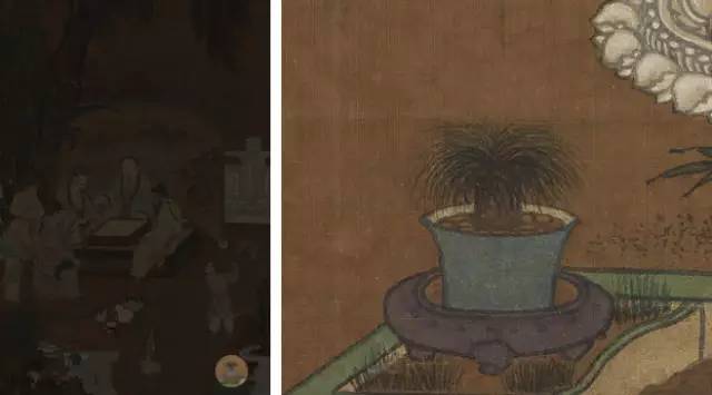 画面中央摆设“插屏式”山水画屏,底部为抱鼓墩座,前置大榻。另有面心嵌大理石漆桌,屏风后面有花腿高束腰方桌,桌子轮廓皆为“壸门”式,腿足间饰突出云翅纹。斑竹椅形制讲究,前有延伸脚踏连接,此类竹制家具奇巧雅致,深受文士喜爱。前景另有石案,纹理仿如斑竹,上置松树盆景,旁列盆养石菖蒲。选用仿古铜器造型之钧窑花盆,绿、蓝釉颜色典雅古朴,更增添庭中雅趣。
