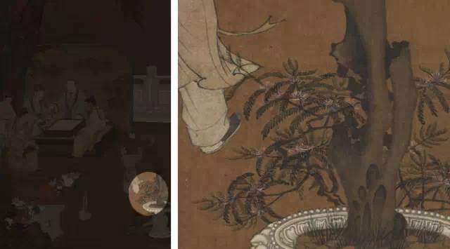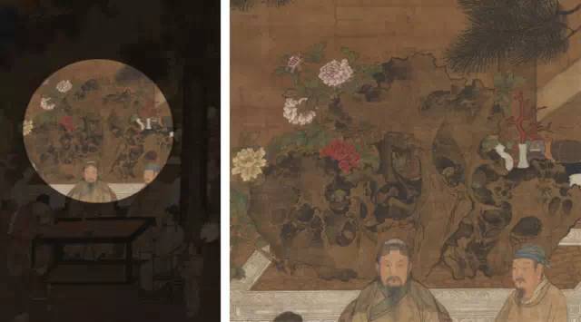 苍松挺立,高大湖石峙立于须弥座花台,红、白、粉紫牡丹栽植于石隙中,珍花奇石争奇斗艳。画中文人端坐,预备听琴会友,案头列炉焚香,青烟袅袅而上,呈翘足鹤型,与背景长松搭配,具有“松龄鹤寿”画意。童仆或抱琴于前,或执羽扇立于旁,或捧盒或瀹茗。后方摆置剔犀漆盒、品茗瓷碗及珊瑚树盆玩。藉由器具铺陈摆设,彰显出文人雅士闲居生活的高雅格调。