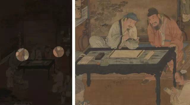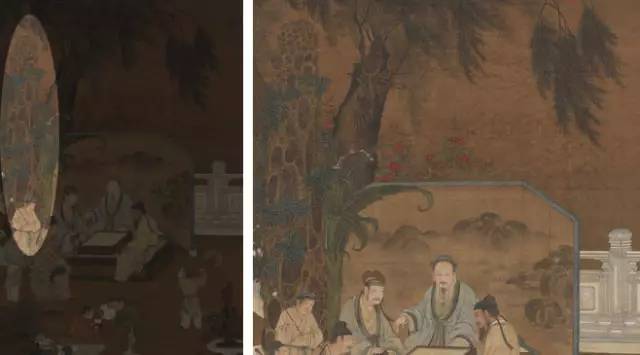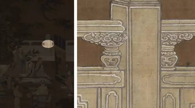 园苑柳枝迎风摇曳,绿蕉丹榴,以奇古石笋点缀,前有棕榈、菖蒲、含羞草栽以佳器,置诸于庭中。士人围坐于“剔犀”漆榻及瓷墩上,二对奕,二旁观,表情凝神专注;数名侍僮分执如意、团扇随侍在侧。正中摆放八扇折屏,陈设室外可挡风凭依。屏心绘有仿米家山水,云漫山腰,丛树朦胧,茅舍隐现。屏后汉白玉石栏杆,栏板雕饰张口吐舌身边缀以云朵的游龙,方形覆莲式柱头,均为明代官式石工作法。