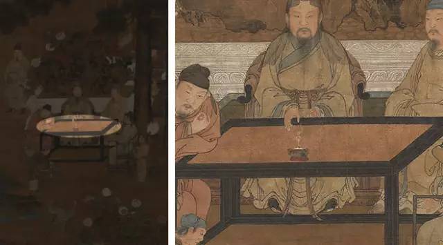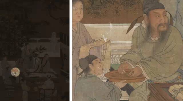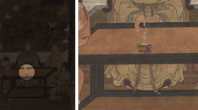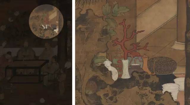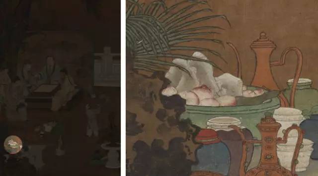 前方带基座石桌满置多样茶酒器皿,盆内盛有冰镇桃果。童仆手捧白瓷执壶、茶瓯、黑漆托子,正欲注茶入碗。大型杏叶式执壶与白碗,胎质洁白莹润,为典型明代嘉靖(1522-1566)以后形制,其他嵌宝石金托、爵、执壶亦是。画中器物用品精心陈设,呈现明代贵冑文士考究的生活赏玩。
