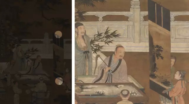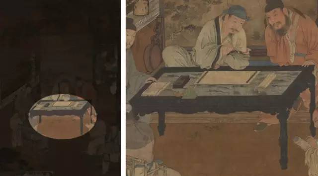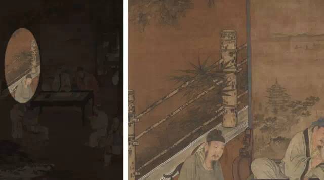 庭园内梧桐高耸笔直,斑竹栏杆曲绕。文士博学好古,以文会友,一人半跏趺坐于榻上,执笔构思,一人手执书卷,俯首旁观。余者分坐于曲搭脑灯挂椅、湘妃竹椅及瓷墩上,展书阅读;另有童仆手捧书函、卷册,侍立于左右。画中可看到装帧讲究之线装书、函套及书页版式。