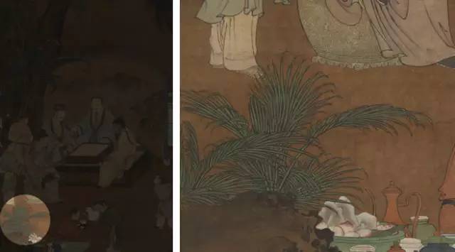 画家为雅集盛事铺陈苑囿景致,挺拔高大,松、柳、梧、槐掩映,汉白石、斑竹栏杆曲护;文士悠闲从事着燃香、奕棋、展书、观画等赏玩活动。全画工笔重彩,人物面貌端严,姿态各具,尊卑主次分明,衣纹采用细劲流畅的“钉头鼠尾”描。庭园内湖石盆景纵横错陈,几榻、桌案、墩椅、画屏、雕漆、瓷铜、文房等日常用物摆设,皆以工整写实技法绘出,显现典型明代宫廷院画风格。从画中器具样式,推断其创作年代应在明代中、晚期。