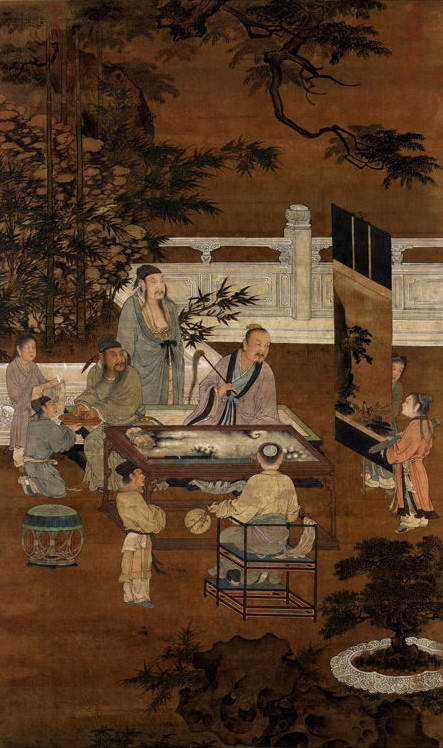《万历野获编》有云:“嘉靖(1522-1566在位)末年,海内晏安。士大夫富厚者,以治园亭,教歌舞之隙,间及古玩。”明代中叶以后,宫廷贵族乃至文人士大夫颇流行于园林聚会,透过书画器物之品鉴,营造出“闲雅好古”富有美感的生活方式。士人雅集活动的闲情逸致与审美品味,蔚成庶民大众所向往仿效之优雅典范。此组十八学士图呈现当时社会物质文化极度的精致化、艺术化,可谓晚明人“清玩赏鉴”美学之最佳写照。