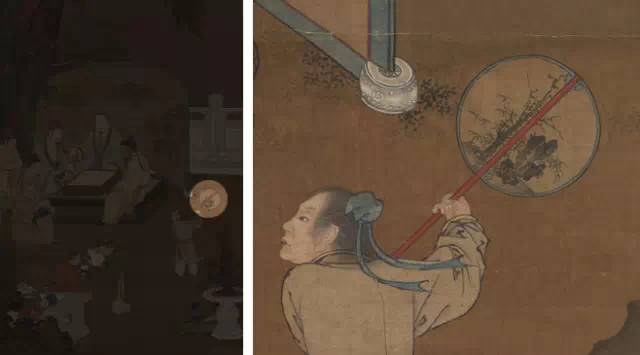 青槐树荫下,翠竹与文石同植于须弥座花坛。花园中石栏上部为覆莲柱头,栏杆寻柱下雕有净瓶与如意云纹,为典型官式作法,多用于皇家园林之中。文士右手执麈尾,左腕搁于腿上,桌前摆置卷帙,两目凝神观画,口中若有所言。其他一盥手回眸,一袒衣立于后,另一背对观者手持团扇。童仆五名奉画轴及盥具,一以叉竿悬挑画障。画中“边角”山水以斧劈皴与水墨刷染,树叶用笔疾速,与明人仿南宋马远作品构图笔法相似。