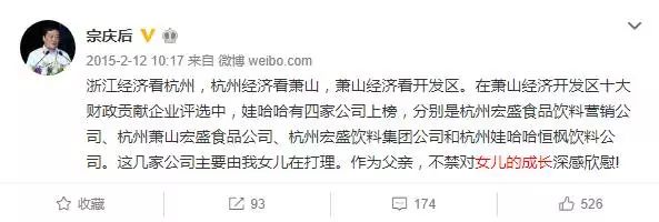 有女如此,硬汉宗庆后都忍不住公开点赞。2015年2月,这位父亲在微博发布消息,浙江萧山经济开发区十大财政贡献企业评选里,娃哈哈有四家公司上榜,“这几家公司主要由我女儿在打理。作为父亲,不禁对女儿的成长深感欣慰!”