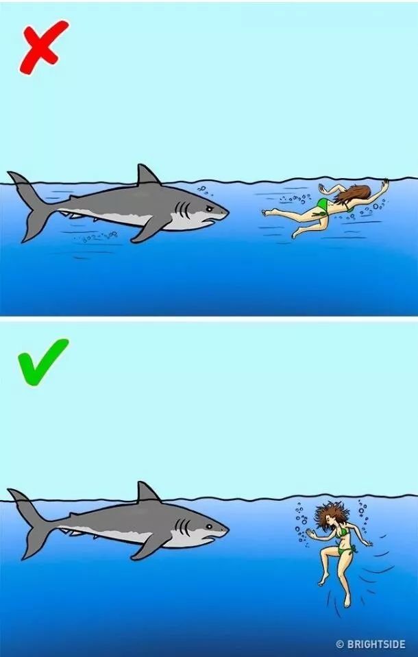在150多种鯊鱼当中,只有约20种会攻击人类。首先,不要在水里尿尿或是流血,以免吸引鲨鱼。然后,如果遇到鯊鱼,不要背对它逃跑,以免被认为是猎物。最后,如果真的要战斗,攻击它的眼睛和鳃