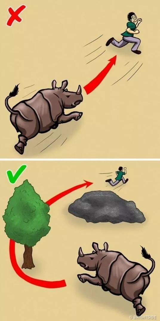犀牛视力很差,很容易被吓到,并且攻击人。犀牛的时速可达60公里,所以遇到犀牛追你时,最好躲在树后面,它们很难在灌木或是草堆里找到你
