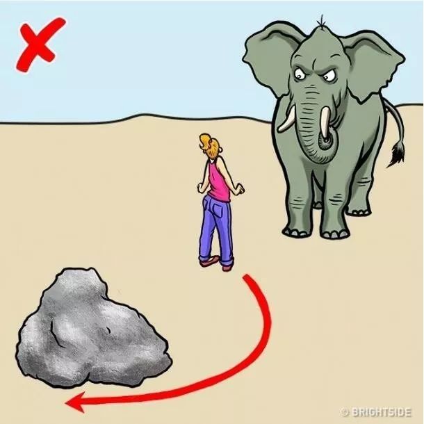 大象发怒是很恐怖的,要注意它的肢体动作,当象鼻和耳朵朝后,代表它要踩你。遇到大象攻击,不要逃跑,要找树或是石头之类的屏障