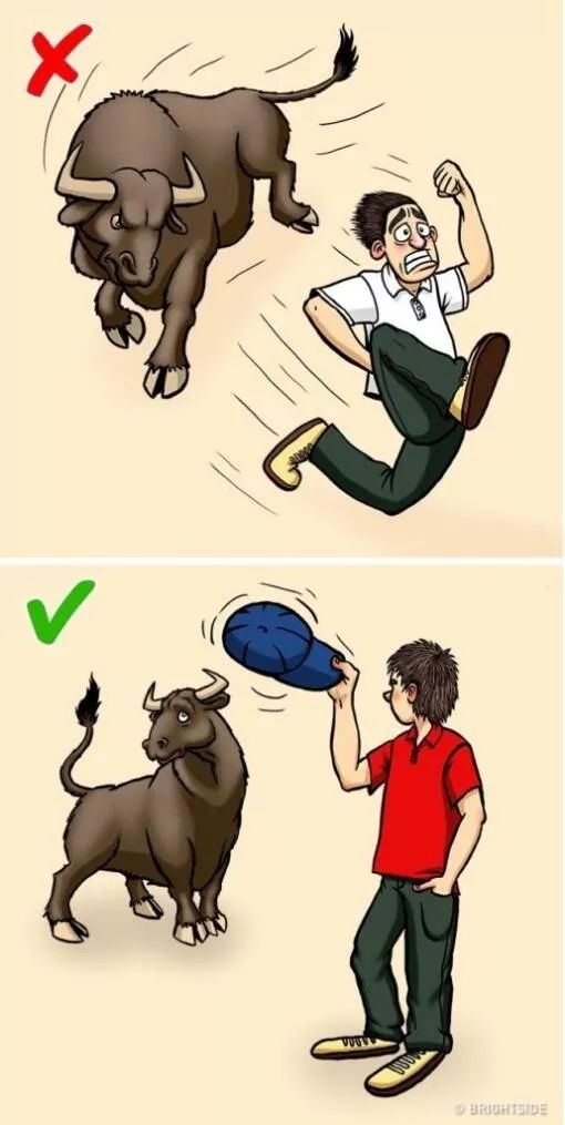 公牛是对“动作”而不是“红色”敏感,如果牛冲向你,站住不要动,用衣服或帽子当作饵,等牛过来时把东西丢出去,它就会被迷惑