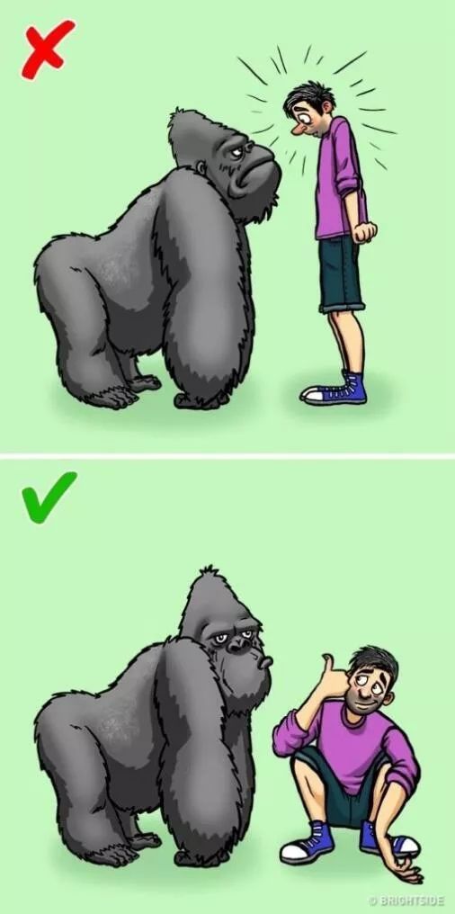 遇到大猩猩,最好坐下让自己看起来跟它们差不多高,不要和他们对视,如果遇到攻击,把自己变成球一样滚动逃跑,大猩猩不会攻击弱小无防备的动物