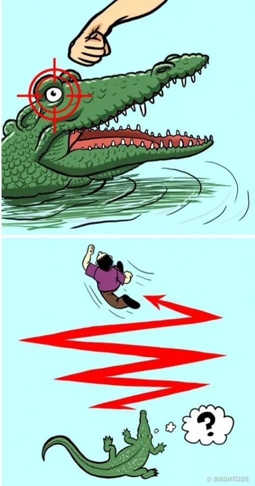 如果你发现它爬向你,尽量发出噪音然后用Z字型的方式逃跑;如果你在游泳时发现有鳄鱼,不要激起水花也不要大叫,因为会吸引注意,安静的游开就好;如果不得不战斗,攻击鳄鱼的眼睛和喉咙,这是它最脆弱的地方