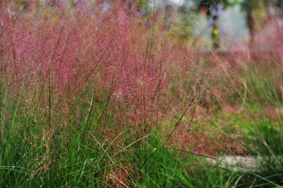 粉黛乱子草又名毛芒乱子草,株高可达90厘米,花期9至11月,开花时花序从基部长出并簇生多个发丝般的长分枝,粉紫色的分枝以及枝头细小的花四散展开,状如云雾。如大量丛植,便会形成粉色雾状花海,美艳梦幻,不由人不喜欢。