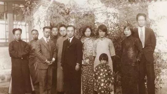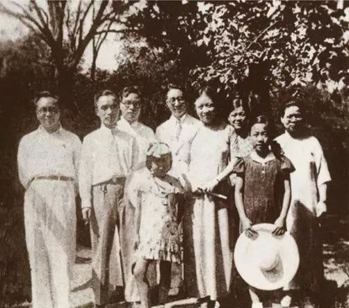 ▲1933年春朱自清夫妇(左六、七)在郑振铎宅前合影