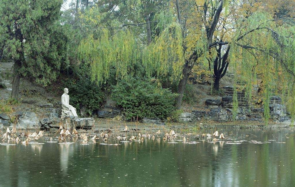 ▲矗立于清华荷塘边的朱自清汉白玉塑像