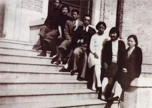 ▲1932年朱自清(右四)与陈竹隐(右一)摄于清华图书馆