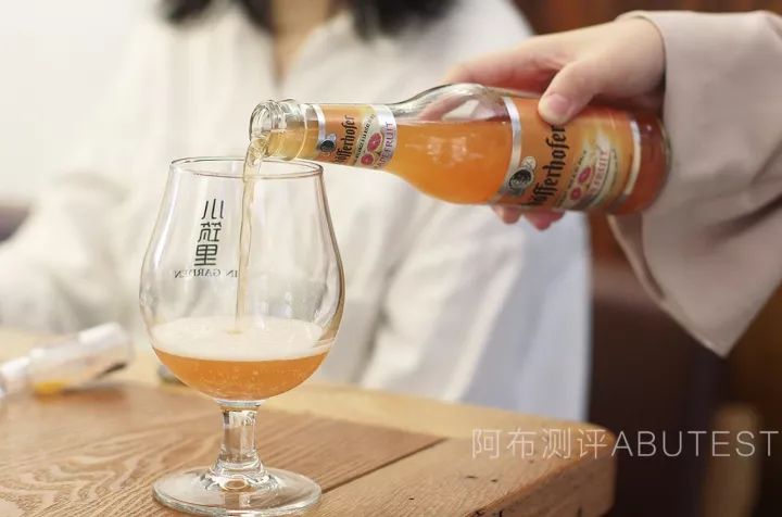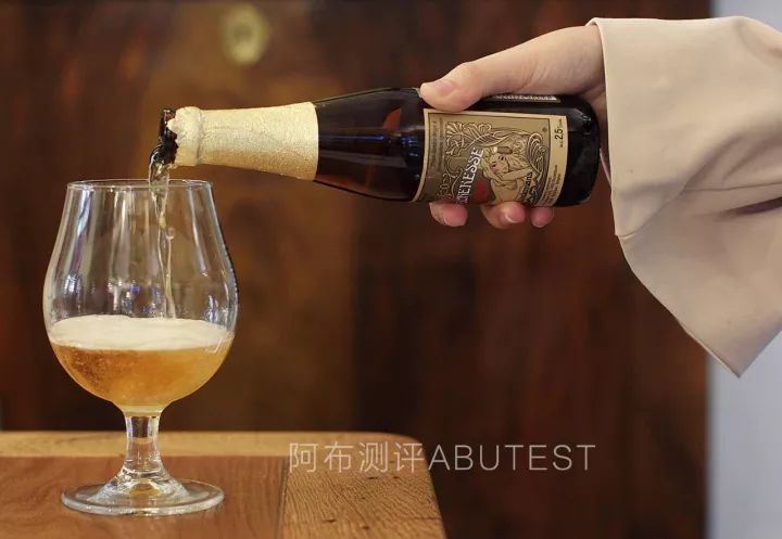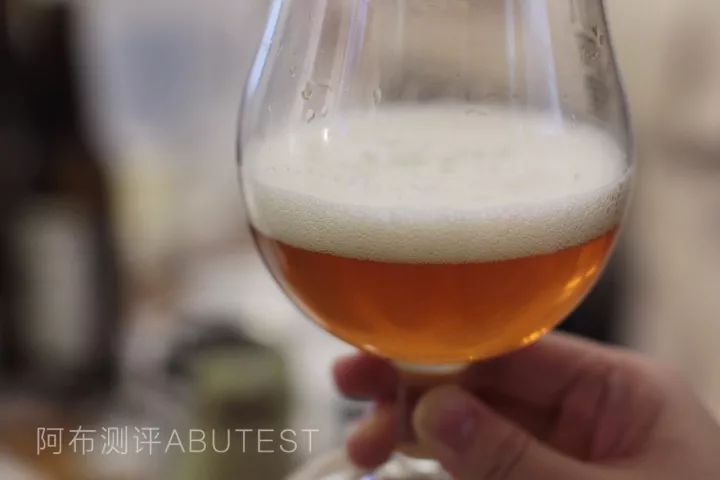 酒体的颜色是淡黄偏橙色,泡沫丰富,但不持久。