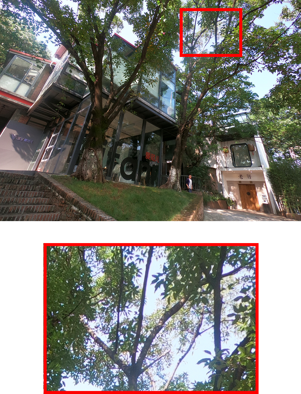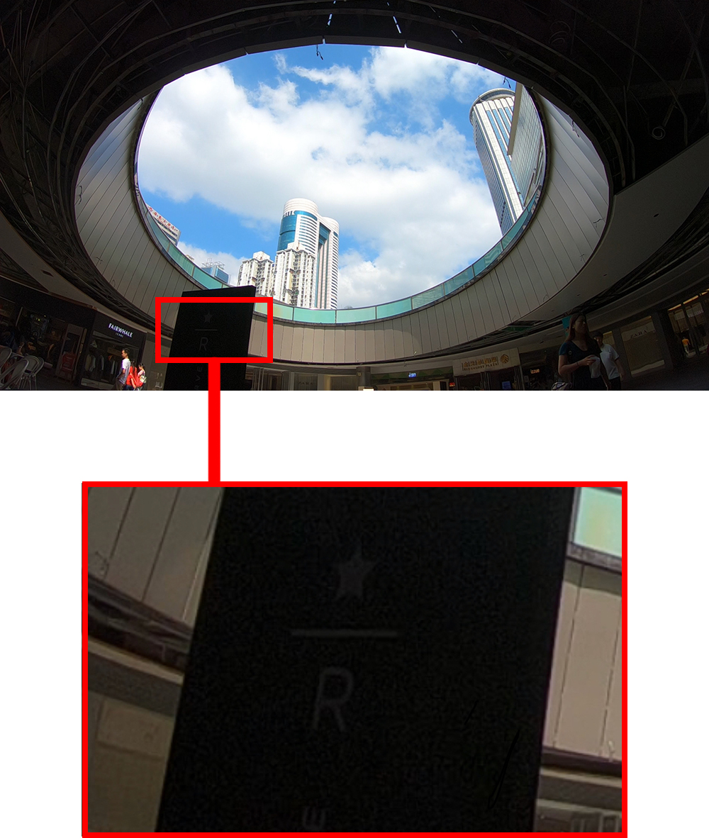 暗部拉高100,高光降低100 后导出的JPEG 文件,可以发现Hero 6 的画面整体亮度更高那么,Hero 6 在自己最擅长的白天里有什么瑕疵呢? 色散和鬼影是超广角镜头的其中两个老大难问题,高品质的超广角镜头会通过超低色散镜片、镀膜等技术和结构的优化来尽可能降低色散和鬼影,但即便是尼康14-24mm 金广角这种级别的全画幅超广角镜头,依旧无法100% 地消除色散。