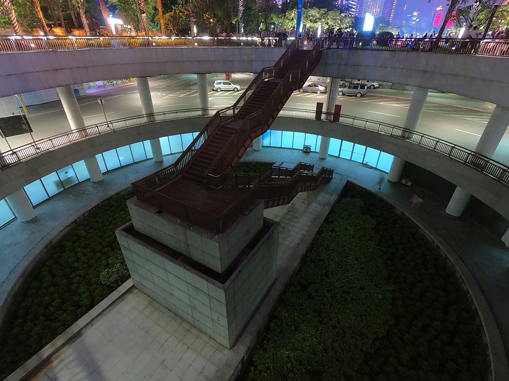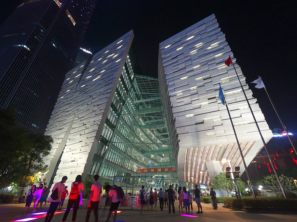 这张是延时视频的截图,摄于国庆节期间的深圳,画面中央写字楼细节丰富,右上角背光处的电线管道和左下角的咖啡厅广告牌也没有一片死黑。