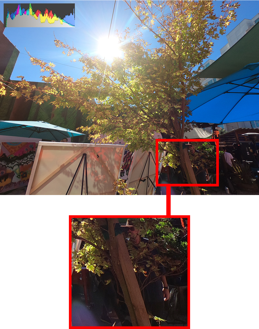 饱和度、对比度更棒,Hero 6 更难能可贵的是把原本就已经很棒的宽容度再提高了一点。 这张照片大约摄于下午三点,尽管相机已经正对太阳取景,场景光比极高,画面右侧树干部分的暗部细节仍然隐约可见,直方图显示这张照片曝光均匀。