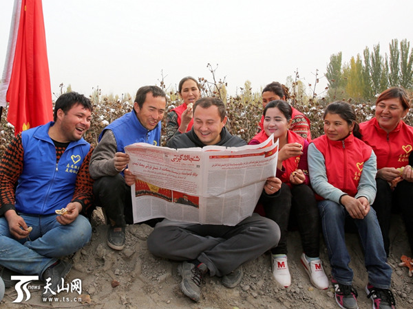 10月28日,新疆喀什地区疏勒县阿拉力乡海尼且村村民的棉花地里,自治区人民政府办公厅驻疏勒县阿拉力乡海尼且村工作队队员艾斯卡尔·艾合买提,带领“和谐海尼且”志愿服务队队员,帮助贫困村民捡棉花。劳动间隙,艾斯卡尔·艾合买提带领大家学习十九大精神。