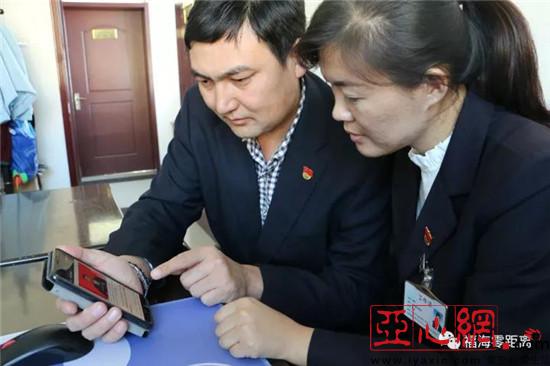 10月30日,在福海县福海镇机关办公室,镇长努尔兰别克·夏热牙提正在与干部郭燕一起从微信平台上学习讨论十九大会议精神,这是福海县学习十九大会议精神的形式之一。