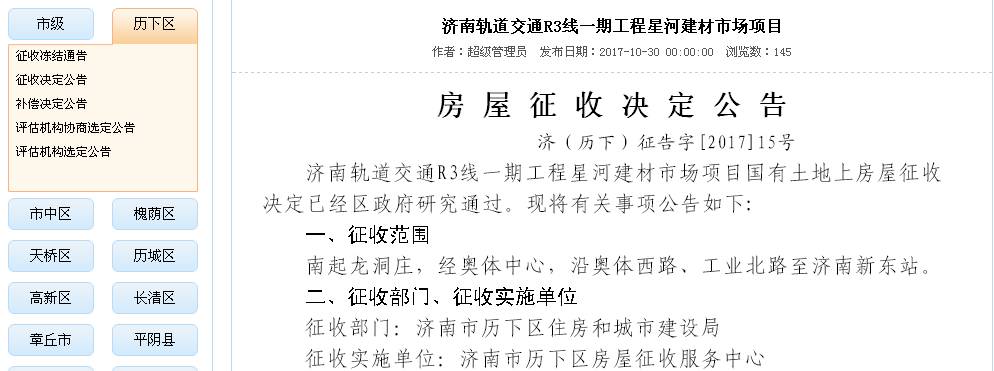 济南轨道交通R3线一期工程星河建材市场项目国有土地上房屋征收决定已经区政府研究通过。现将有关事项公告如下:
