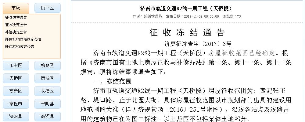 原标题:济南又有多个核心地段要拆迁征收!具体位置快看这些公告! 最近济南拆迁征收又有新动向了快来看看刚公布的几个公告有没有你家1.轨道交通R2线一期工程(天桥段)济南市轨道交通R2线一期工程