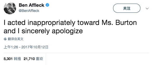 本·阿弗莱克在电视节目中抓女主持人海莉·波顿左胸的往事被翻出来,大本之后在推特上正式道歉,坦诚自己的举止不合适。