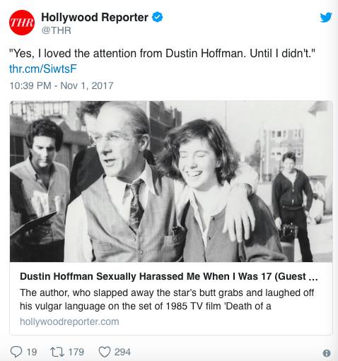 另一位奥斯卡影帝达斯汀·霍夫曼也牵涉进一桩30多年前的性骚扰事件,女演员安娜·格拉汉姆·亨特公开发文透露她17岁与霍夫曼合作《推销员之死》时,遭到对方的性骚扰。
