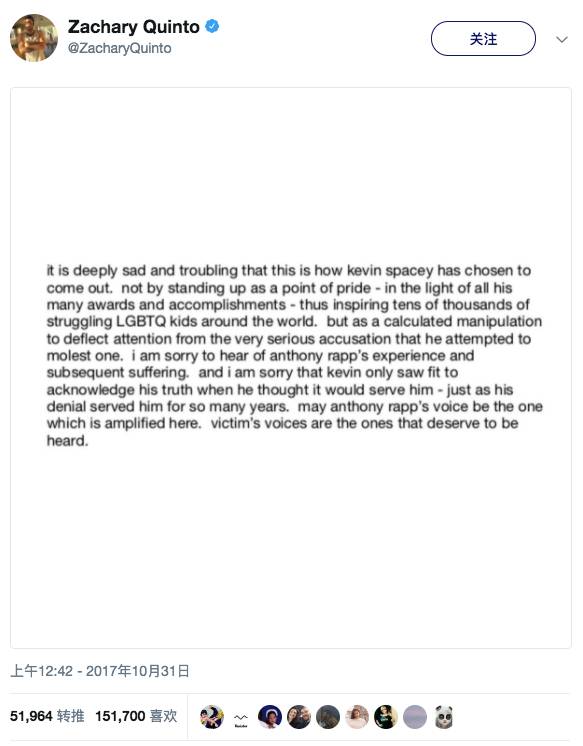 就连跟史派西合作过《商海通牒》的出柜男星扎克瑞·昆图,都在推特上公开发文diss他。