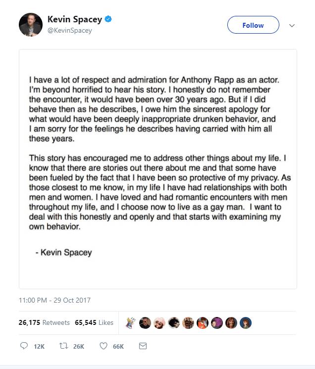 当然,凯文·史派西的事件并不是偶然。这更像是今年一系列好莱坞丑闻的连锁反应。