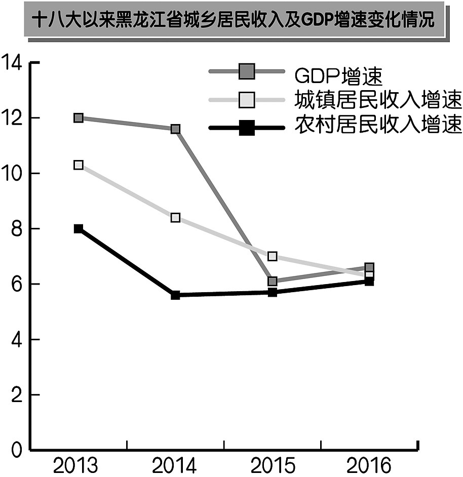 城乡居民收入增速跑赢GDP。十八大以来,我省加大惠民投入力度,不断完善收入分配制度,连续出台一系列促进居民收入增长政策措施,城乡居民收入实现历史性跨越,收入总体增速超过GDP。国家统计局黑龙江调查总队抽样调查数据显示,2016年我省全体常住居民人均可支配收入达到19838元,比2012年增长38.7%,年均增长8.5%。其中,2016年城镇常住居民人均可支配收入达到25736元,比2012年增长36.2%,年均增长8.0%。2016年农村常住居民人均可支配收入达到11832元,比2012年增长41.4%,年均增长9.0%。
